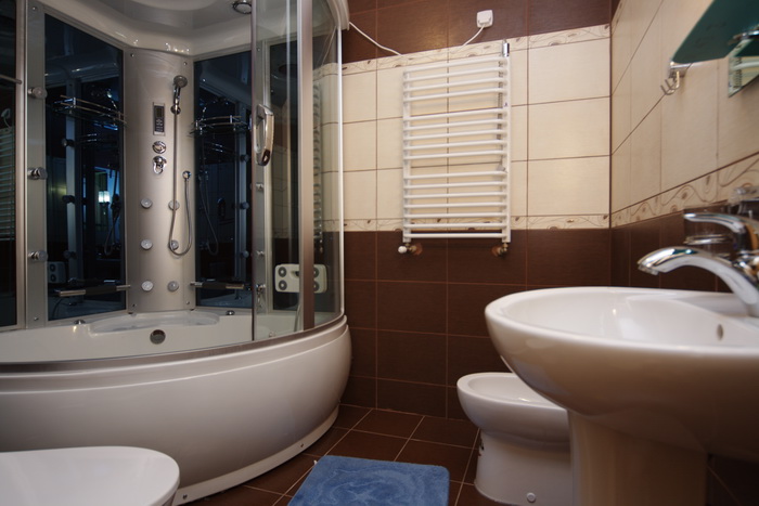 кровати, в гостиной - раскладной диван, санузел (гидромассажный бокс, туалет,